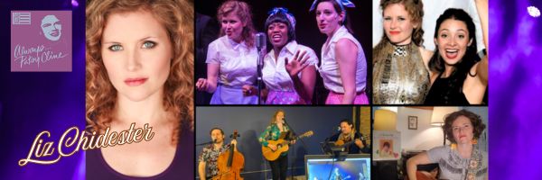 Pictured above, clockwise from left: Liz Chidester; Liz with Angela Alise & Lauren Vogel (fiddle player for Always…Patsy Cline) in Buddy – The Buddy Holly Story; Liz with Molly Hernández (Louise in Always…Patsy Cline) celebrating Buddy – The Buddy Holly Story at the 2018 Jeff Awards; Liz performing a Patsy Cline song as part of the Dead Ringers for Dead Singers fundraiser; Liz with Lewis Rawlinson & Nilko Andreas (guitar player for Always…Patsy Cline) performing “Women of Americana” as part of The Garage series.